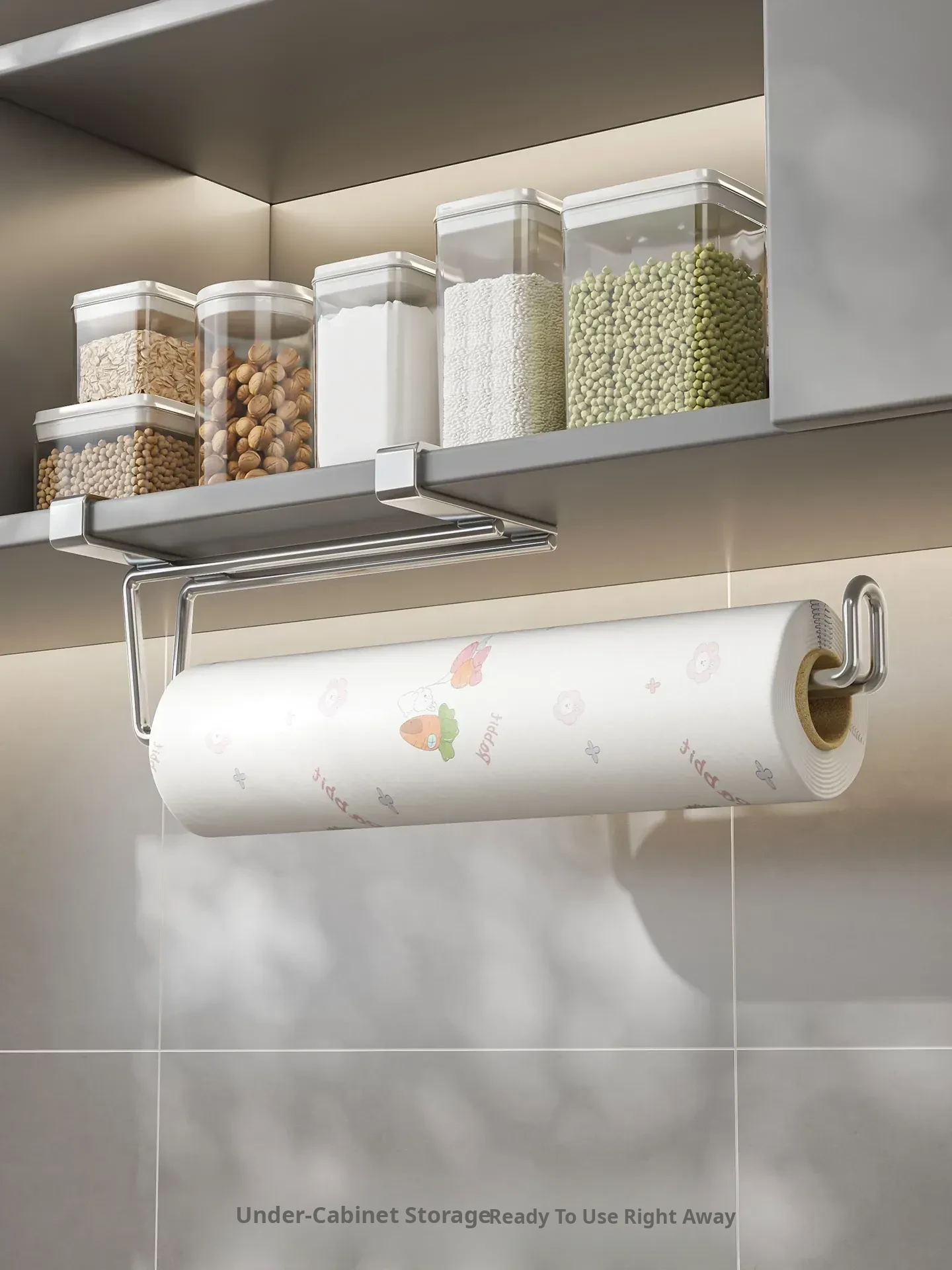 No-Drill Under-Cabinet Paper Towel Holder - Convenient Storage Rack for Roll Paper, Oil-Absorbent Paper, and Cling Film. Perfect for Organizing Your Kitchen!