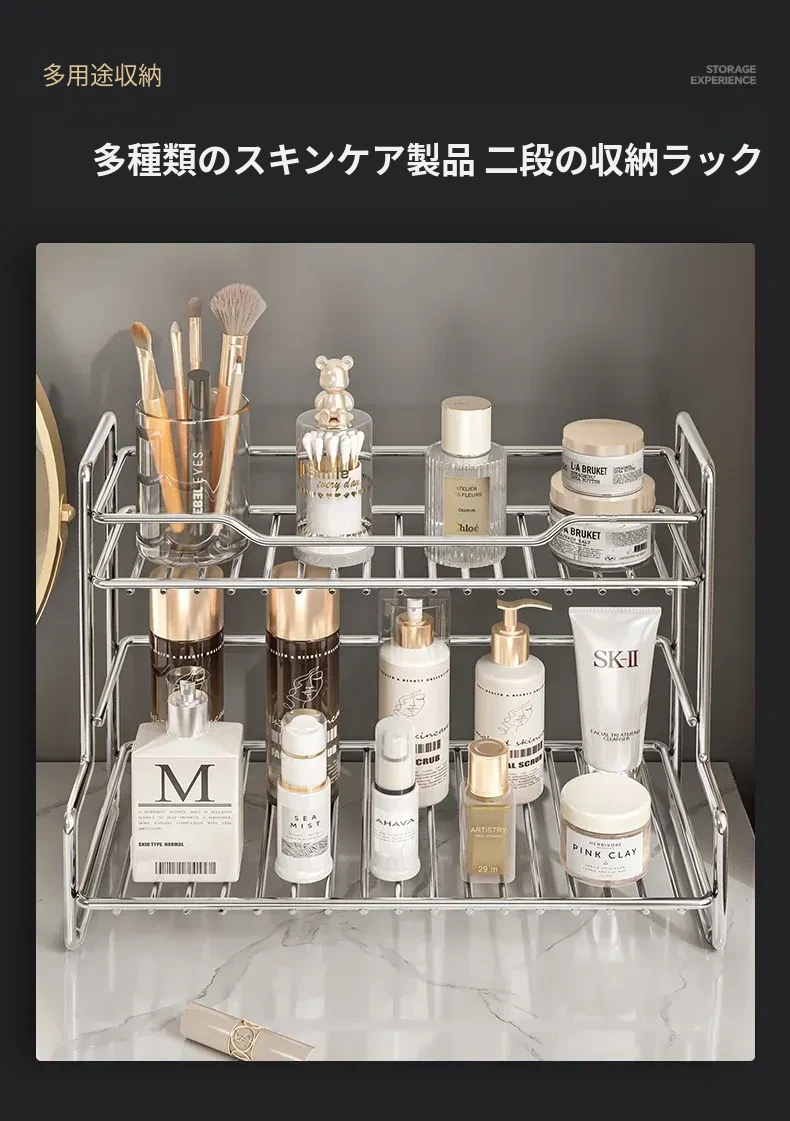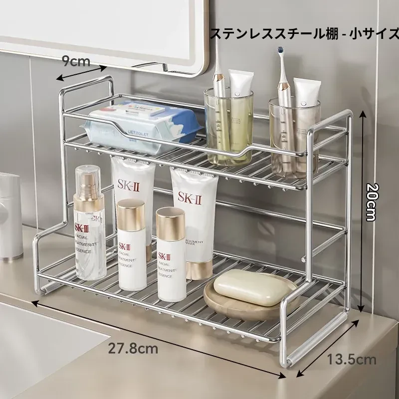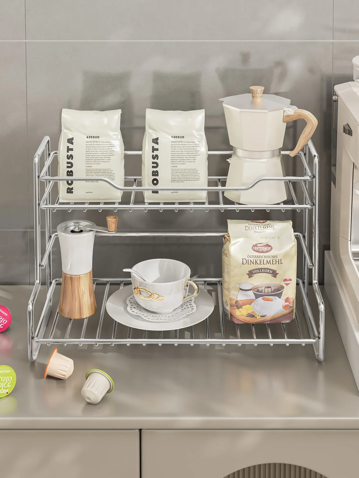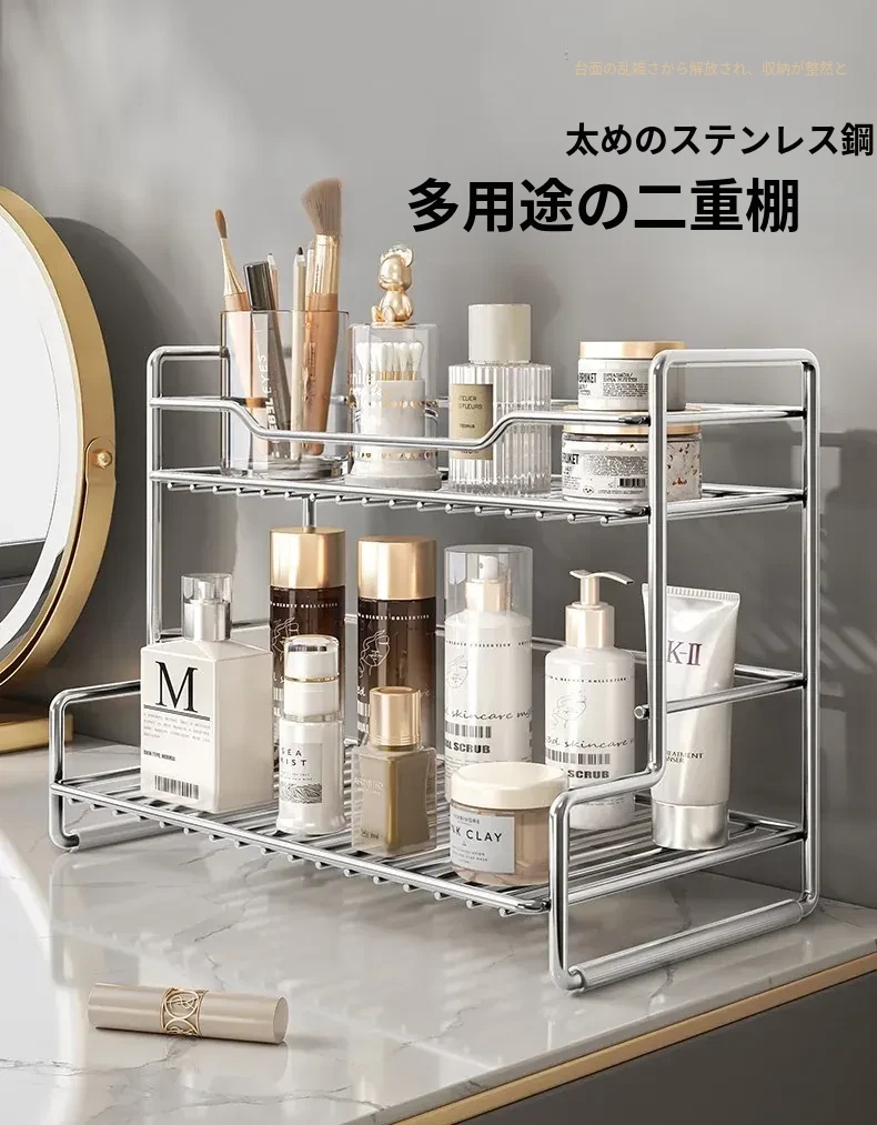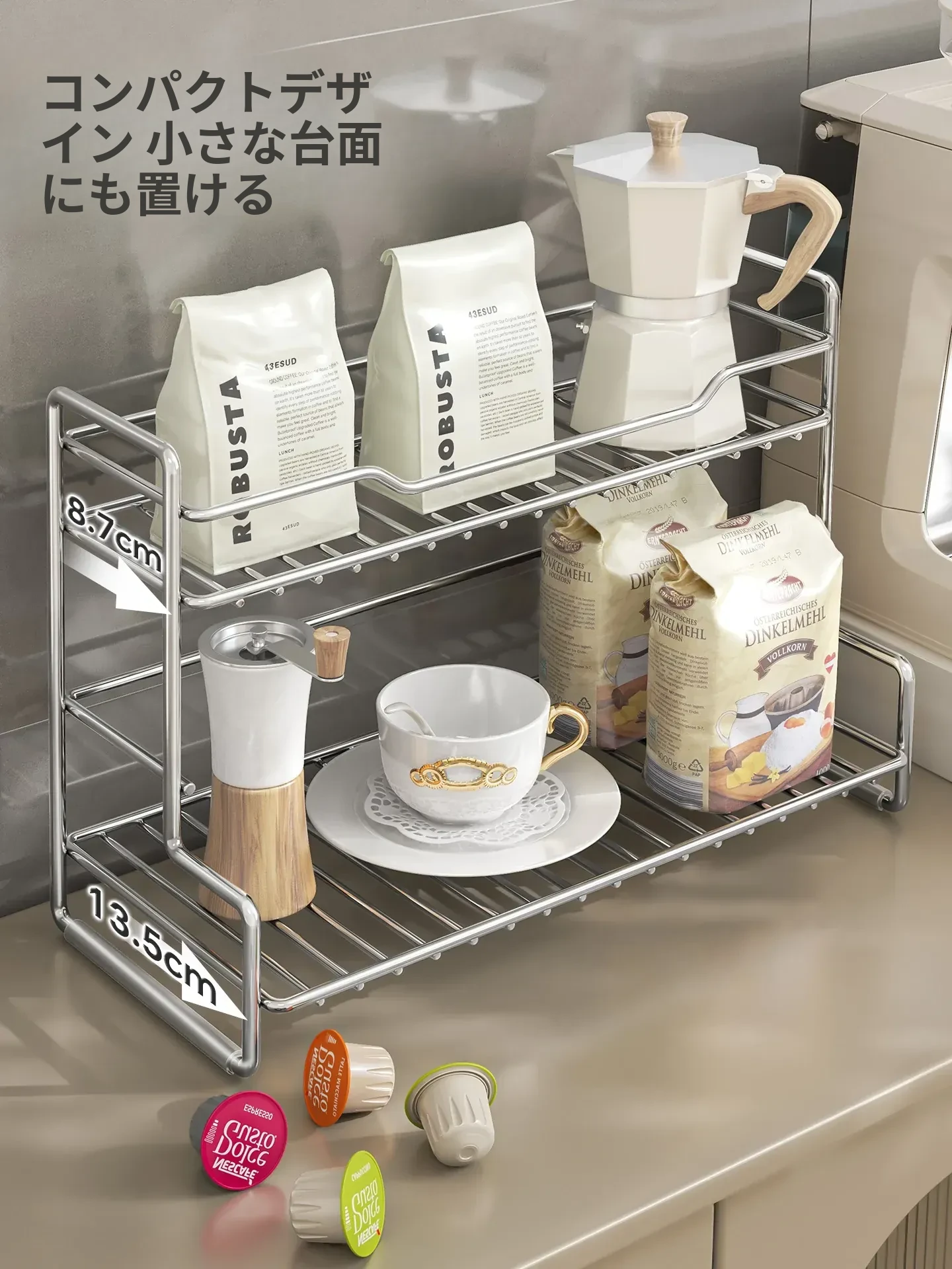 シンプルなステンレス製収納ラック|水杯や雑貨の整理に最適なキッチン調味料用スリム二段収納棚!省スペースでスタイリッシュなキッチンを実現!