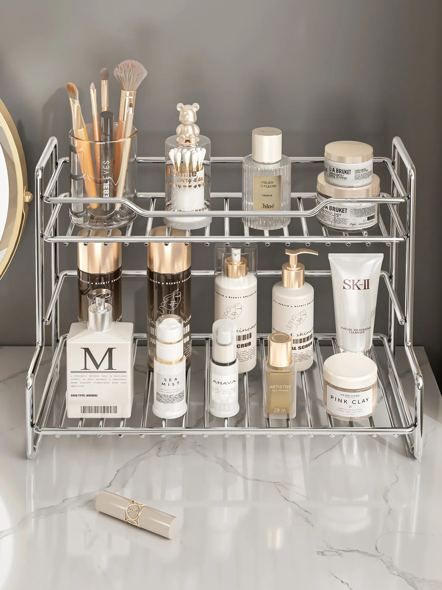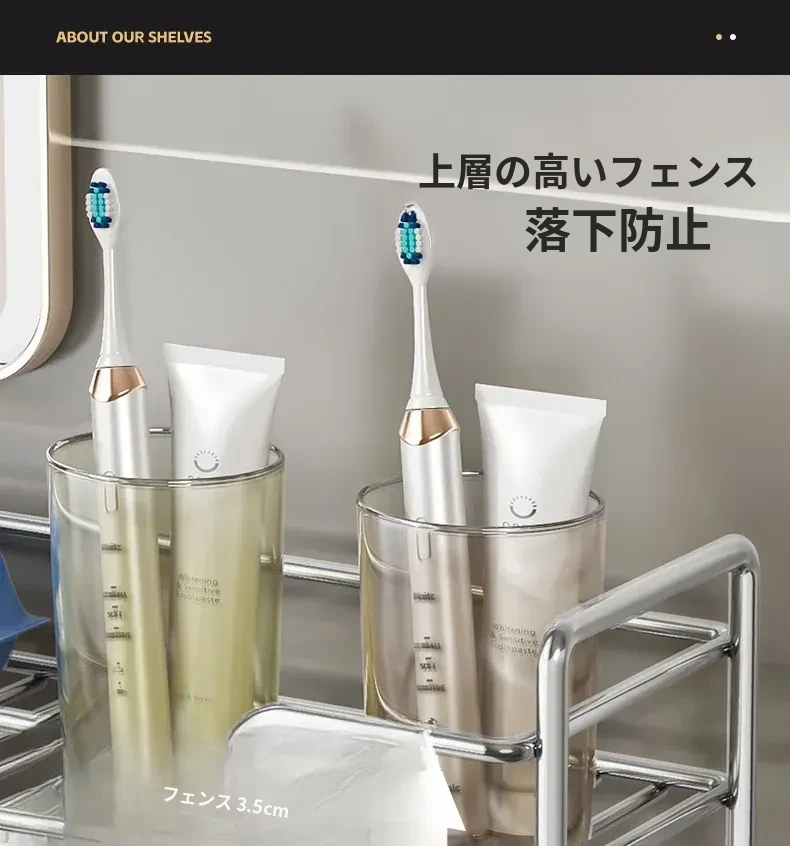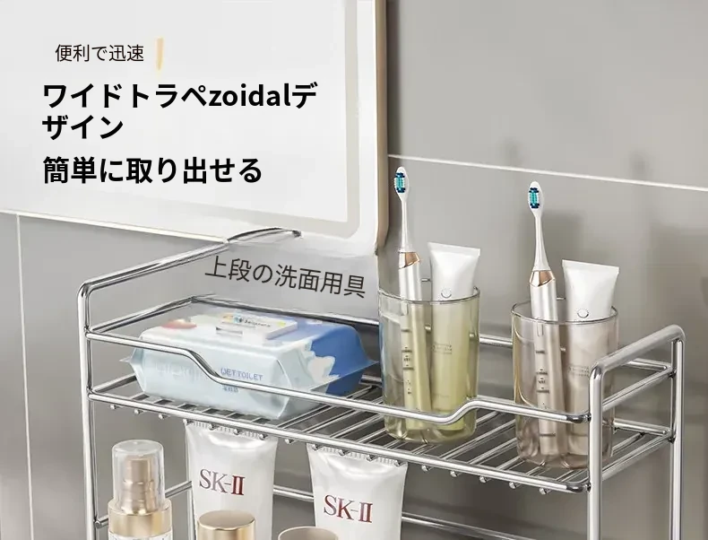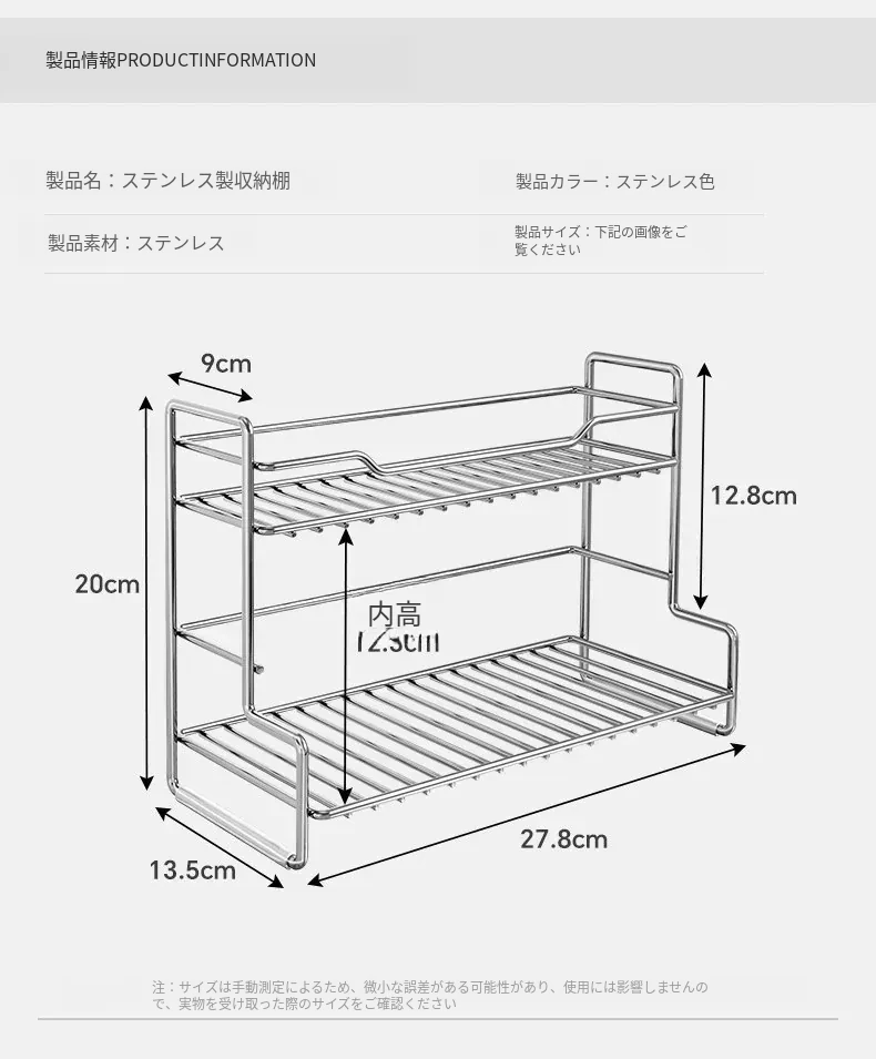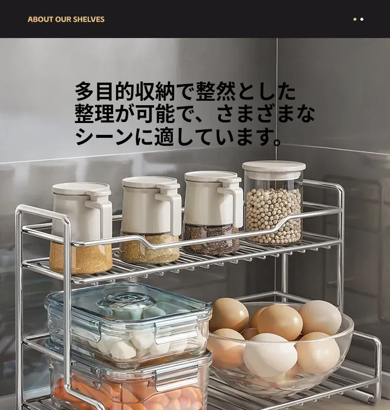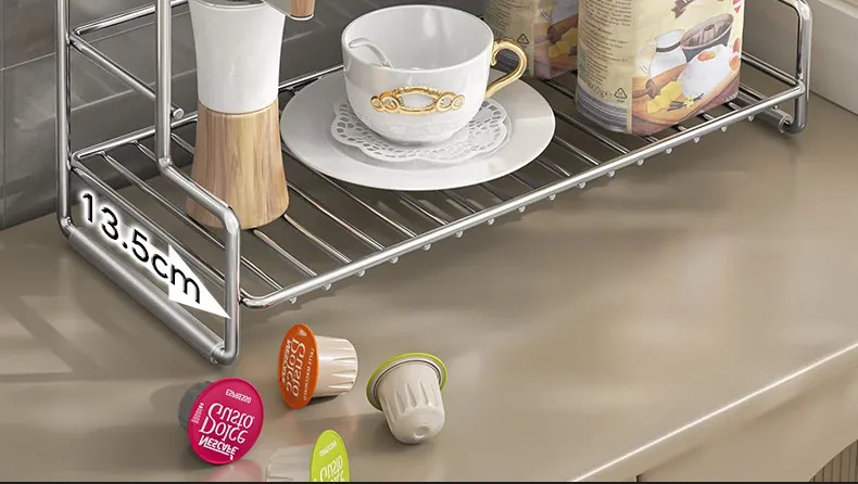 シンプルなステンレス製収納ラック|水杯や雑貨の整理に最適なキッチン調味料用スリム二段収納棚!省スペースでスタイリッシュなキッチンを実現!